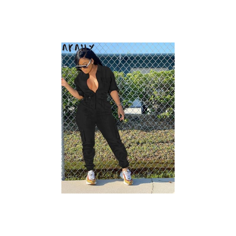 Akaily Summer Solid Bodycon Cargo Jumpsuit Women 2023 Casual Black Zipper Loose Jumpsuits One Piece Pockets Long Rompers Female
