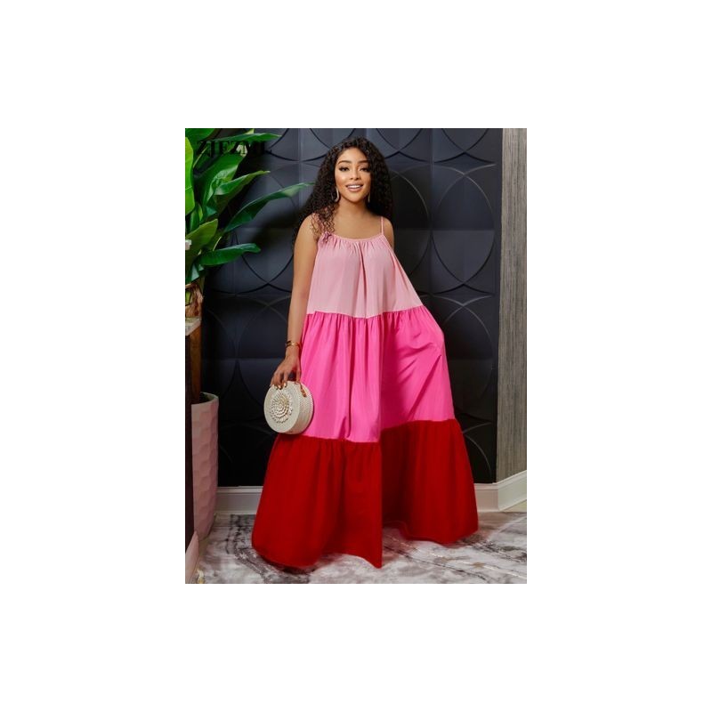 Summer Color Block Sexy Spaghetti Strap Big Swing Floor Length Dresses for Women Long Club Party Beach Dress Vintage Robe Femme