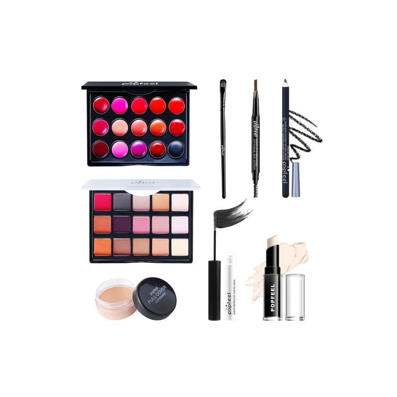 A: eye shadow tray *1, makeup brush *8, sponge egg *1, eyeliner *1, mascara *1, lipstick *3, concealer tray *1, cosmetic stick *1, liquid foundation *1, body sequins *1, lipstick *3, eyebrow pencil *1