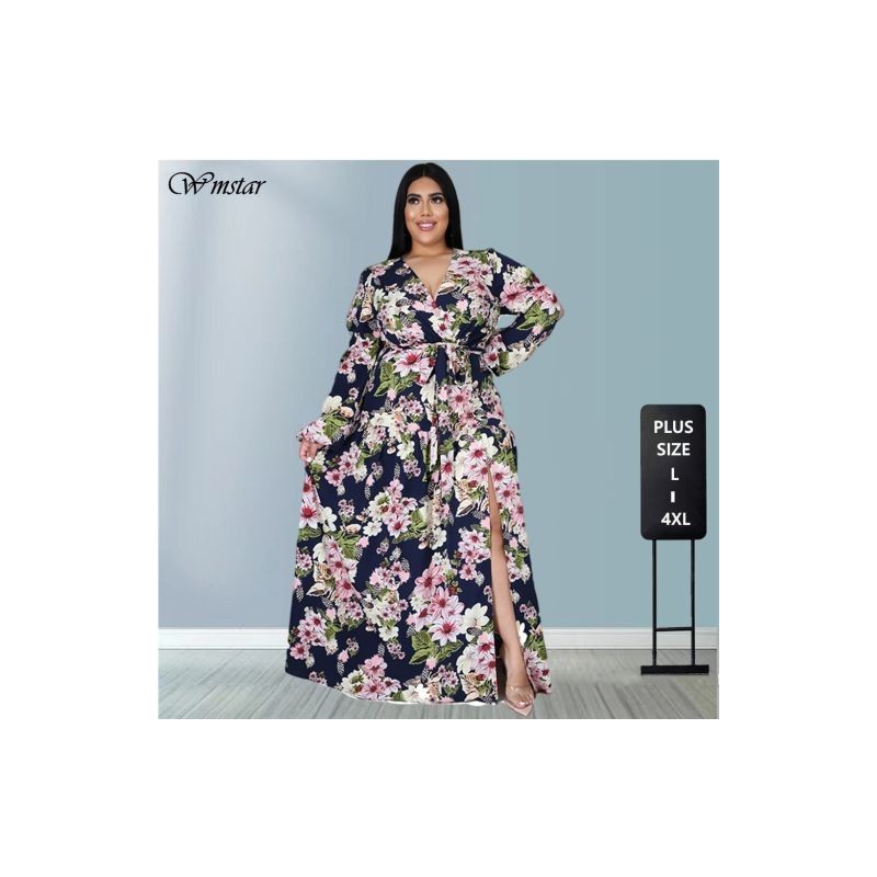 Plus Size Dresses Fall Clothes for Women Elegant High Waist with Belt Print Maxi Dress High Streetwear Wholesale Dropshippin