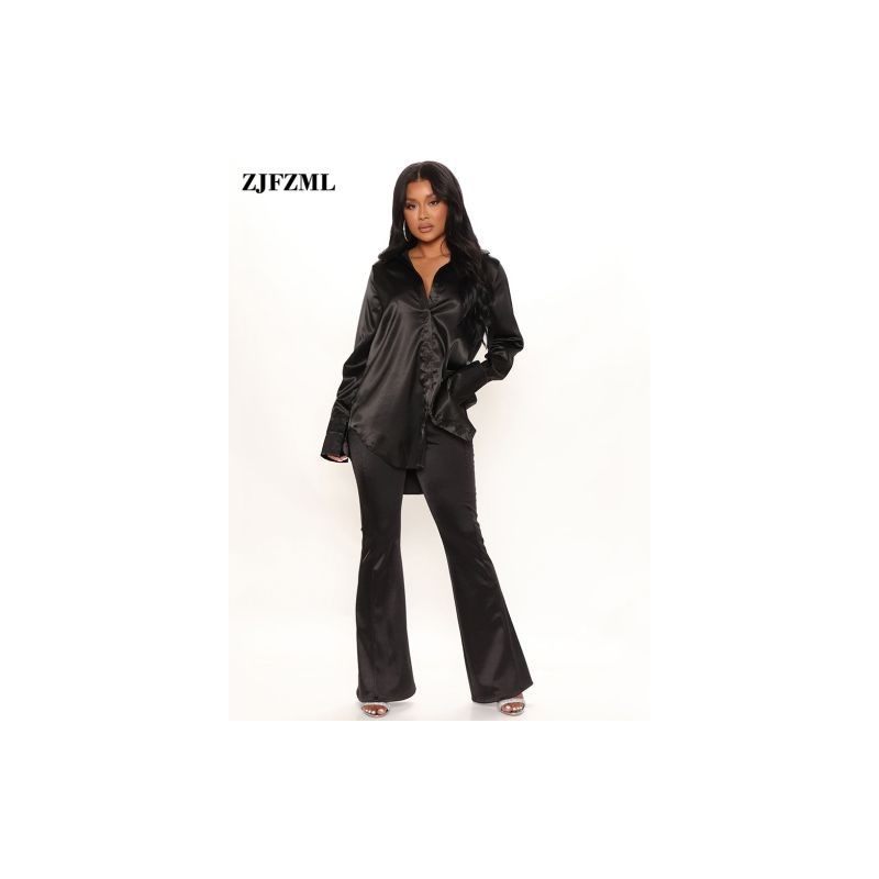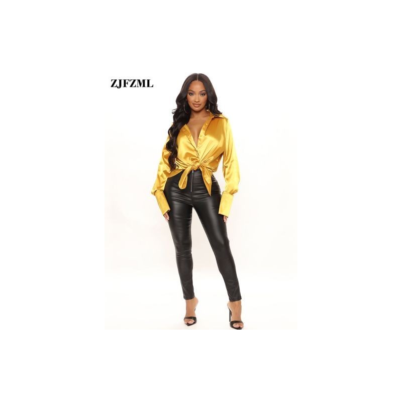 Nyári szexi szatén női ing lehajtható gallérral egysoros, hosszú ujjú, oldalsó kiömlött alkalmi blúz Nyári ruhák nőknek