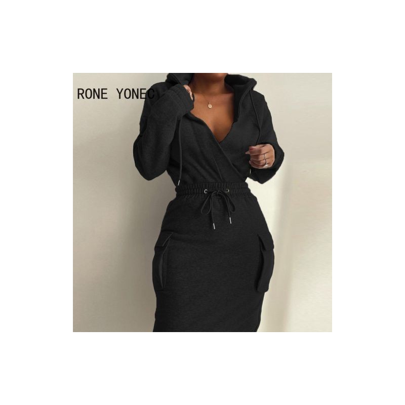 Women Solid Hooded Tape Casual Wrap Dress Long Sleeves Pocket Elastic Waist Sweatshirt Dress