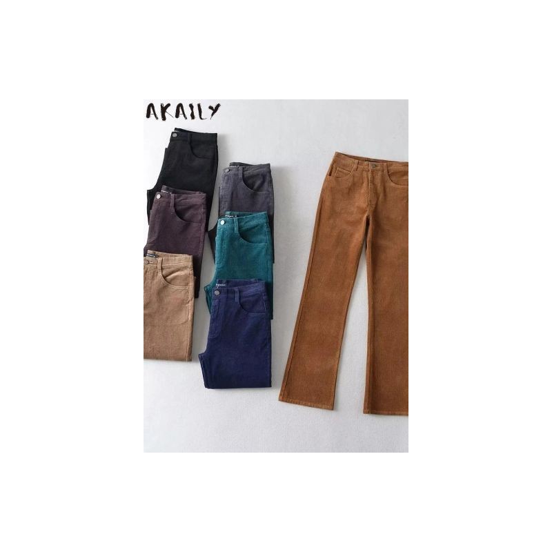 Akaily Fall Winter Brown Corduroy Pants Women Fashion 2022 High Waist Flare Baggy Pants Ladies Straight Casual Long Trousers