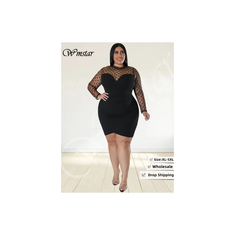 Plus Size Dress Women Sexy See Through Mesh Patchwork Dot Print Mini Dress Fashion Club Outfits