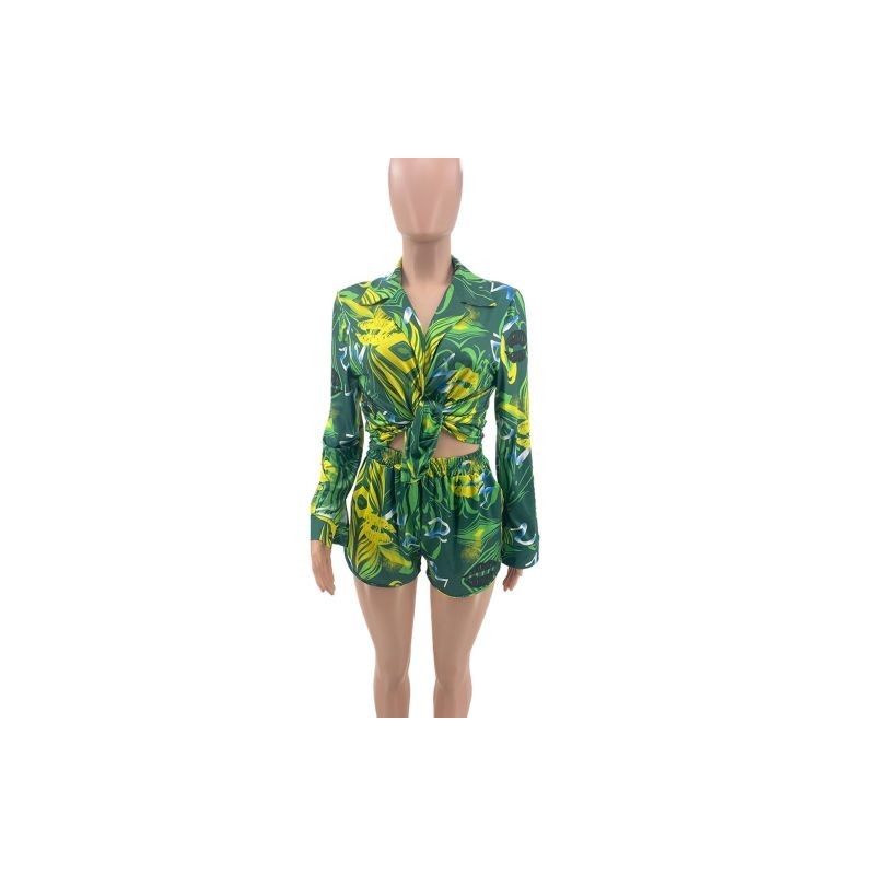 Divatos, velencei nyomtatású, kétrészes női szett, alkalmi, lehajtható gallérral, hosszú ujjú bő inggel és elasztikus derekú motoros rövid Y2K
