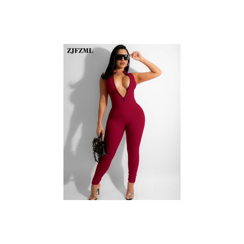 Casual Solid Women Ribbed Skinny Jumpsuits Outdoor Wear Zipper Front Turtleneck Rib Bodysuits Simple Elastic Hight Slim Clothes
