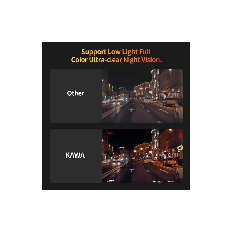 Equipped with image processors for WDR and 3DNR noise reduction, the KAWA dash cam provides sharp images regardless of day and night.