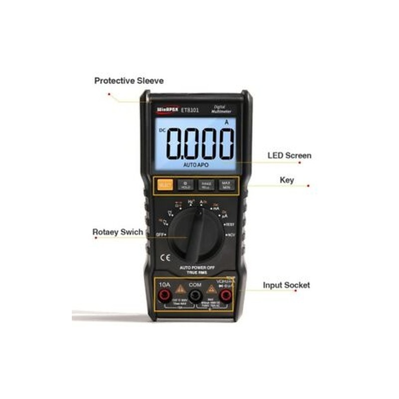 9.10A input port Performance function True RMS measurement:YES DC voltage DCV:YES AC voltage ACV:YES DC current DCA:YES AC current ACA:YES Resistor Diode On-off:YES Frequency F:YES Capacitance C:YES NCV:YES Zero line / Fire wire test:YES Full unit symbol:YES Backlight manual/Auto off:YES